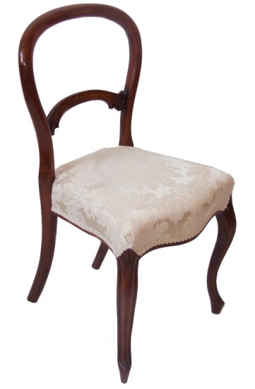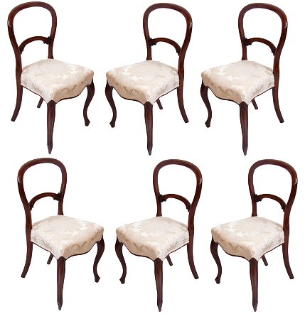 6 Victorian mahogany balloon back dining chairs An attractive set of 6 mahogany balloon back dining chairs with traditional hoop backs, serpentine overstuff seats and cabriole legs, the chairs have been taken back to bare frames and clamped as necessary, prior to traditionally french polishing and waxing. These lovely chairs have been traditionally reupholstered in a beautiful cream damask with co ordinating cream braid. Beautiful condition Price £2200 (Ref : D167) Email Us for a delivery quote : Click Here