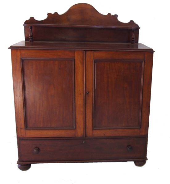 Victorian mahogany chiffonier A lovely Victorian chiffonier with highly figured panelled front doors and lower drawer with wooden knob handles standing on bun feet and plinth. The doors open to reveal a huge area for storage above the drawer, could be used to store a modern television. Beautifully patinated and a lovely mellow colour. Width 49.5" Height 61"(max) 45.5" to surface Depth 23" SOLD
