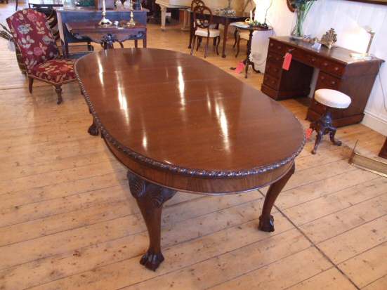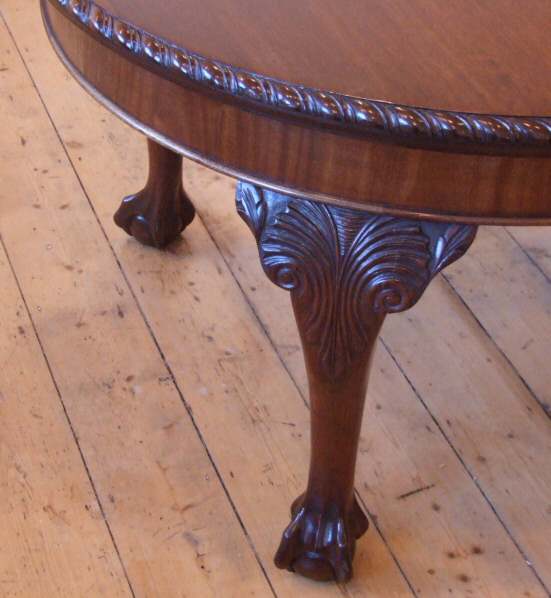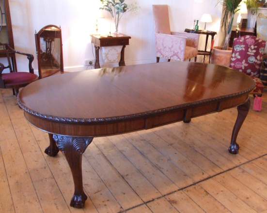 Edwardian Chippendale Style Extending Dining Table In original condition this attractive mahogany 2 leaf extending Chippendale style dining table will seat 6/8. The "D" shaped top with gradrooned edge is supported by 4 large cabriole legs with accanthus detailing to the knees and standing on 4 ball and claw feet. The table has 2 extra leafs and a winding mechanism which allow the table to extend to 82", can be used with one leaf if preferred or just the end sections together.