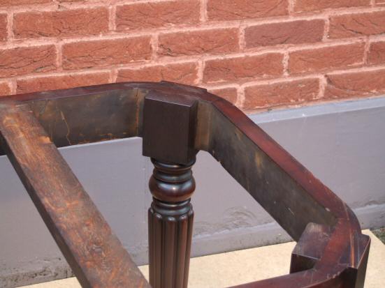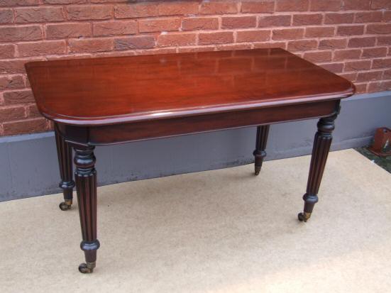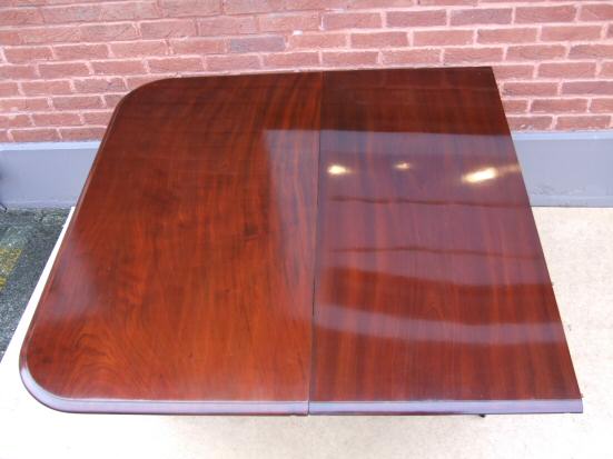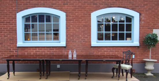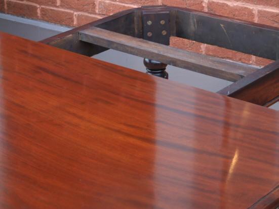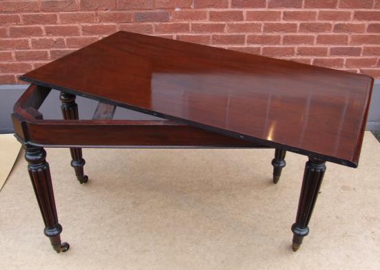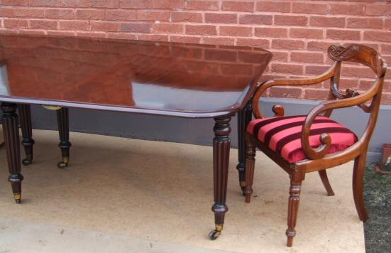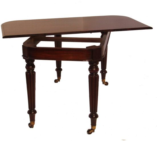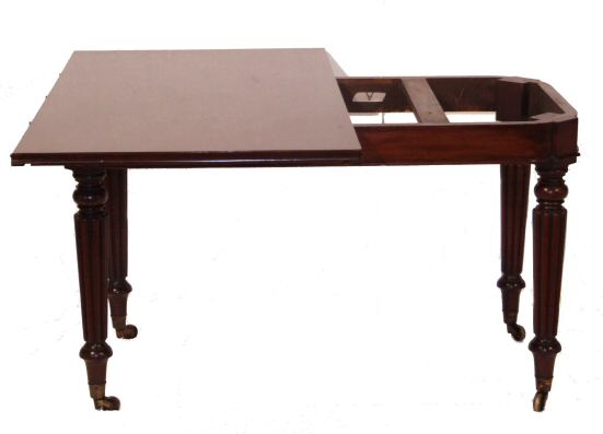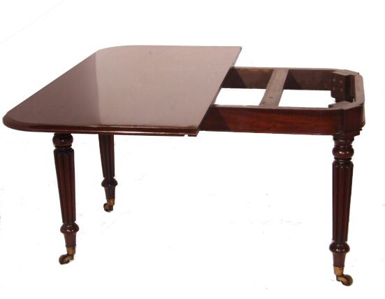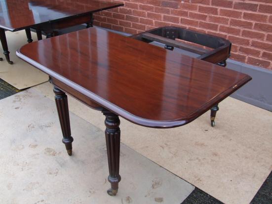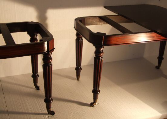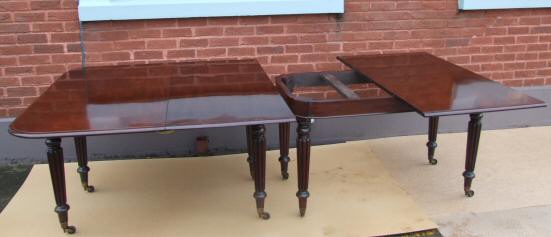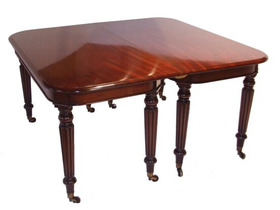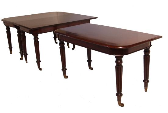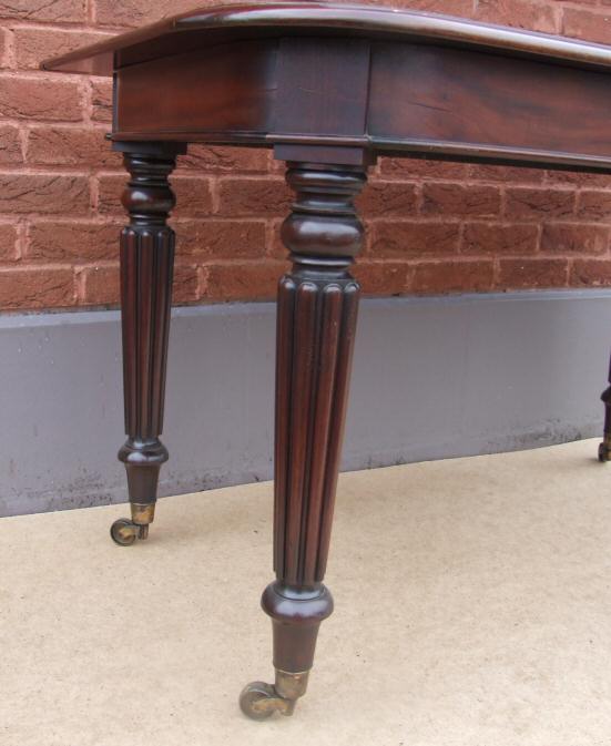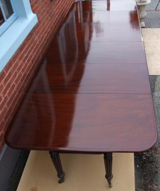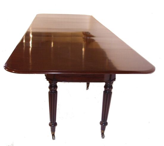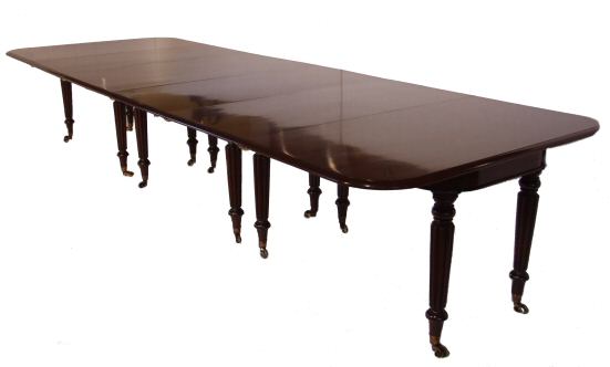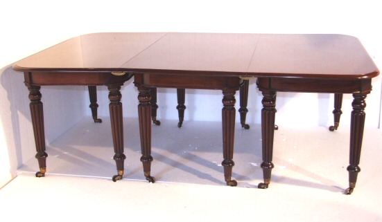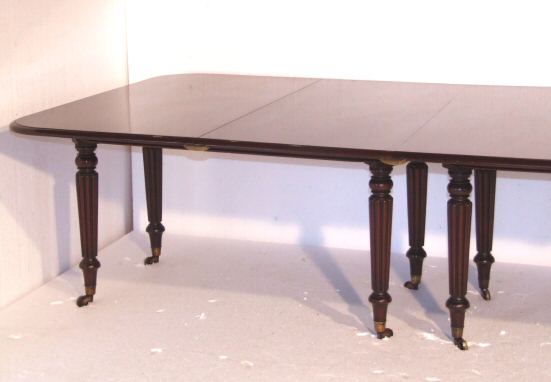 Stunning Late Georgian extending dining table to seat 16 comfortably attributed to Gillows of Lancaster A wonderful and extremely rare extending dining table in a deep rich mahogany standing on slender elegant reeded legs. This fantastic table will configure in a number of ways to allow 8 to 16 people to sit in comfort. Attributed to Gillows of Lancaster, this table is unusual in construction having 3 bases with slender reeded legs, the end sections swivel to allow the bases to be used at their maximm side on to seat 16 or placed closer together short side on to seat 10/12. A rare and unusual design this is probably the most well thought out design we have seen, the legs tuck neatly under the table top to give maximum knee room in all configurations. Every part of this table has good support and even when it is extended to its maximum there is no flexing or area that isnt completely firm. Gillow of Lancaster were one of the most important names to be associated with furniture design and construction in the 18th and 19th Century, some of their items are stamped but a large proportion are not, the clue is in the design, the proportions, the construction and the wonderful quality of the item. This dining table is ingenious in design and construction and will make a wonderful statement in any dining area. Dating to the late Georgian period the table has wonderful slender legs which add elegance and class to the table, as time progressed and the Victorian era came about the legs became fatter and simply not as elegant as their predecessors. Having its original brass casters all in excellent working condition this table slots together with ease and is held in place with brass catches (a later addition), ther is no winding mechanism as this table preceeds the winding mechanism, it simply works by swiveling the leafs at either end of the table and inserting the number of leaves needed. When not needed the central section will make a stand alone table or the end sections can be used as demi lune tables for alcoves if desired. So many options to this fantastic table, it will be really difficult to find something of such rarity for a long, long time. A piece of true craftmanship from an era when quality of work was paramount. Length 12'11" (max) 2 leafs 56.5" seat 6 to 8 3 sections together 84.5" seat 8 to 10 2 leafs and ends 103" seat 10 to 12 Width 53.25" Price £24,950