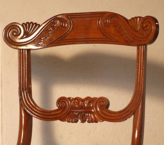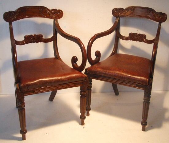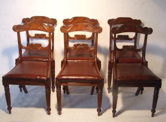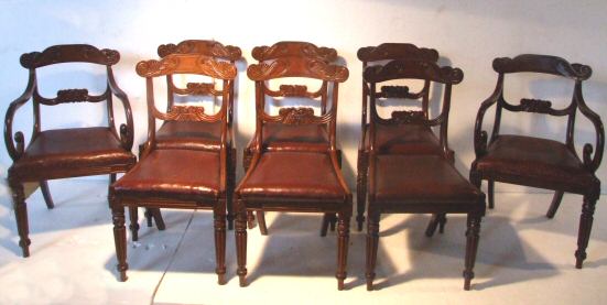Set of 8 Regency mahogany bar back dining chairs A beautiful set of 8 Regency mahogany bar back dining chairs consisting of 2 carvers and 6 dining chairs. The chairs themselves having drop in seats which will be recovered included in the price. The backs of the chairs have beautiful accanthus detailing to the top of either side with reeded upstands and attractive reeded central splat again with completmenting accanthus detailing. The whole raised on attractive reeded legs. The 2 carver chairs are lovely and large with reeded detailing to the curved arms. Beautiful period antique dining chairs in lovely condition. £3,450 (Ref:D194)