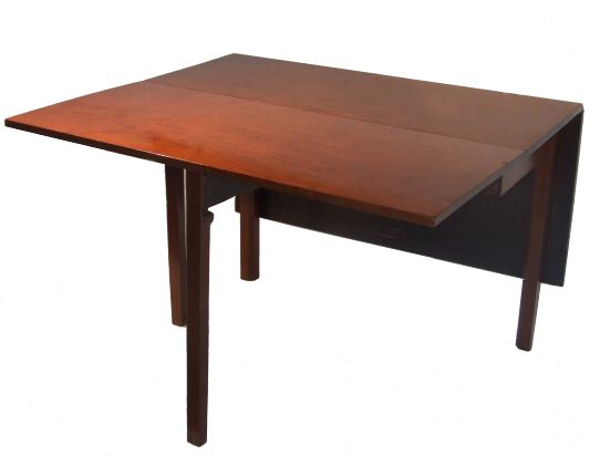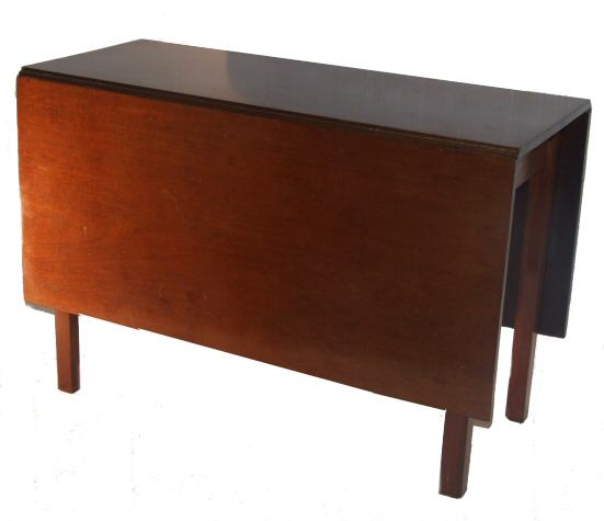 Georgian solid mahogany drop leaf dining table A lovely simple Georgian drop leaf table dating to the mid 18th Century, of simple lines and pleasing proportions this table opens via 2 gate legs providing seating for 6 people. The 4 legs are chamfered on the inside corner with delicate re entrant fluting to the outside corners. A good solid sturdy Georgian table folding down to a compact 18.5". Photo pre workshop.. further photos to be added once it has been through the workshops. Width 42.5" Length when open 56.5" when closed 18.5" Height 28.5" £795 (Ref:D198)