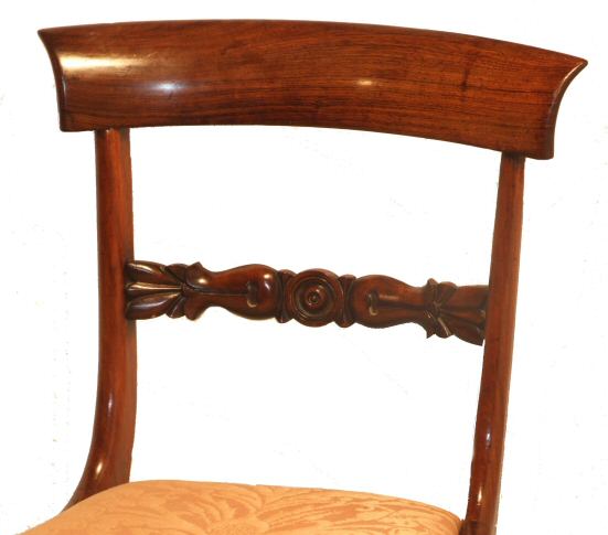 Set of 4 W1Vth Rosewood dining chairs 4 Early W1Vth Rosewood bar back dining chairs circa 1830 - 1837, featuring curved bar back top rails with central carved panel of late Regency/W1Vth foliate carving (typical of this period) roundrel flanked by lotus flowers either side. The whole raised on turned and tapering legs beautifully carbed inverted lotus leaf detail. Having drop in seats which will be re-upholstered included in the price (if you are quick you are welcome to direct us in the choice of material). Price £995 (Ref:D202)