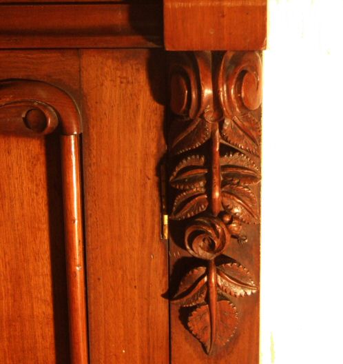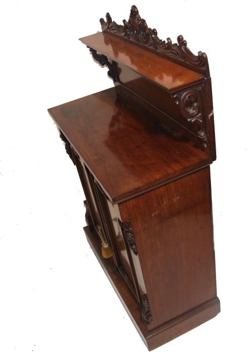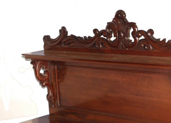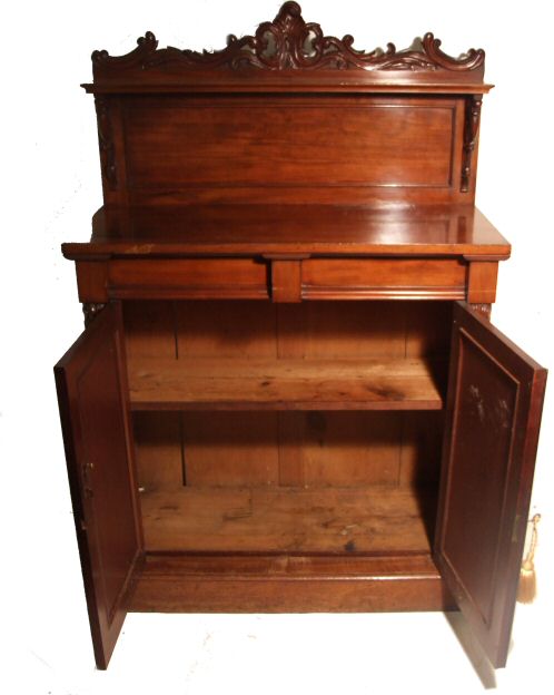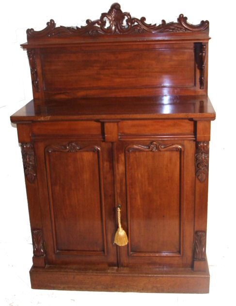 19th Century mahogany chiffonier A 19th Century mahogany chiffonier of small proportions. This beautiful small cottage sideboard has attractive corbelles top and bottom, 2 of which are carved roses with leaf decoration these flank the 2 panelled doors above which are 2 faux drawers. The upstand consists of a beautiful figured panel with gorgeous scrolling brackets which support a further slimline shelf. The whole surmounted by a foliate carved pediment raised on a plinth. A very neat item, extremely practical as well as beautiful in lovely original condition. Max Height 56.5" Height to the top 37.5" Width 37" Depth 16.5" £975 (Ref:D206)