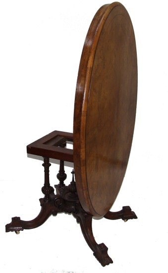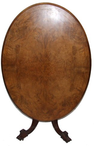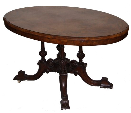 Circa 1850/60 an Oval Burr Walnut Victorian Loo Table. Dating to Circa 1850/60 this wonderful Victorian loo table has a fabulous figured burr walnut top and is quarter veneered in bookpaged veneers and bordered by 2 lines of boxwood stringing punctuated in the corner by marquetry inlay. Below the top is a 2" frieze, again in burr walnut, with a double line of boxwood inlay. The table top lifts to allow this to be used in the vertical and horizontal and will seat 6 with ease. What is striking about this particular table is the detail to the base which is a 4 splay solid walnut base with original patination and superbly carved with 4 turned pillasters each with lobed decoration with a matching finial between. The whole raised on white porcelain china casters. Good colour and condition. Lenght 52" Width 38" Height 28.5" Price £1975 (Ref :D45) Email Us for a delivery quote : Click Here