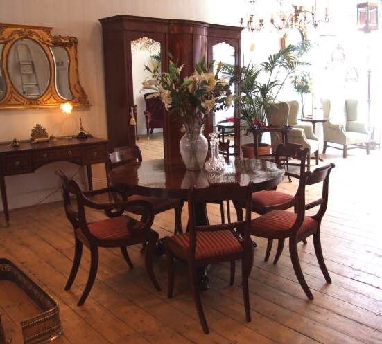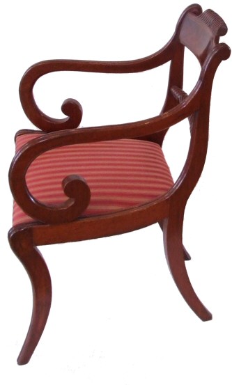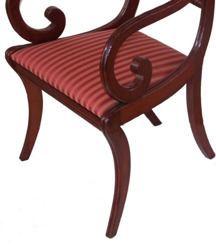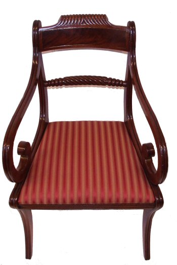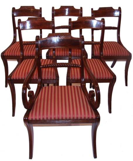 A beautiful set of 6 Regency Rope Twist Dining Chairs A stunning set of 6 Regency Rope Twist mahogany dining chairs. The highly figured bar backs having line brass inlay with rope twist detail to their tops, the central splat being of rope twist design. Standing on sabre legs these lovely dining chairs simply glow. Consisting of 5 dining chairs and one carver they are a lovely set. Having been through our workshops the joints have been checked and clamped as necessary, the chairs have been French polished and traditionally waxed before having the drop in seats rebuilt and traditionally reupholstered in a lovely regency stripe. A beautiful period set of Regency chairs in fabulous condition. Price £2400