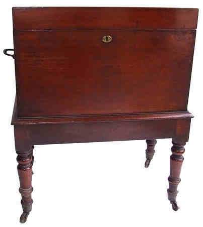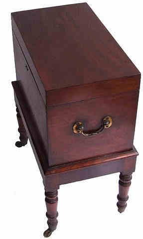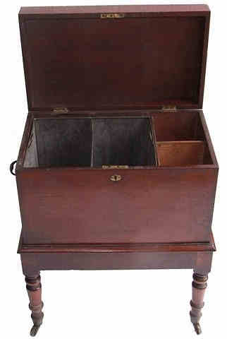 Early 19th Century mahogany cellarette, the four slender turned legs terminate in original brass bucket casters and support the beautifully made rectangular cellarette/box. The hinged top lifts to reveal a double zinc ice box and 2 further divisions for extra wine storage. The exterior is furnished with a pair of solid brass drop handles and the whole is a lovely deep mahogany colour in excellent condition and extremely hard to find. Height 24" Width 11.75" Length 19.5" £1245 (Ref : TAB62) Email Us for a delivery quote : Click Here