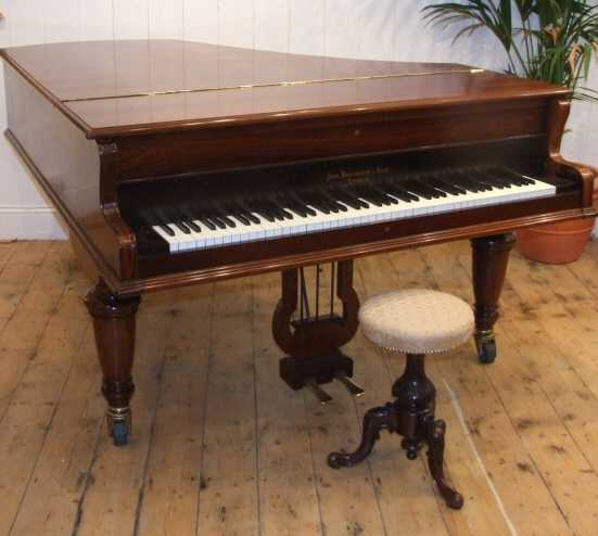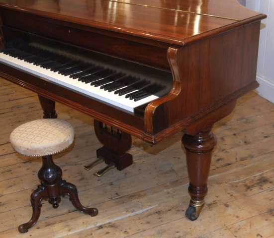 A stunning John Broadwood Boudoir Grand Piano in Rosewood. This lovely antique piano dates to Circa 1900, registration number 46588, and has a lovely bright sound, it is of course as you would expect in concert pitch, and is overstrung and iron framed, The felts and hammers are all in good condition and over the years several strings have been replaced to help maintain its playability. John Broadwood were major piano manufacturers in Britain in the 19th Century and early part of the 20th Century and were extremely highly regarded as such, they were responsible for many new an innovative ideas used in grand piano construction. They patented designs for actions and the strung back, and were among the first piano manufacturers to introduce steel bars and metal hitch plates to pianos, this was a radical improvement to the early wooden frames used as it ensured that the piano could hold its tune better and the tuning pins were not just situated into a wooden frame. Broadwood improved greatly the English grand action which meant that rapid repitition of notes became possible. Broadwood pianos were supplied to many royal family memebers over the years and several prominent composers used Broadwoods for their compositions such as Lizst and Chopin. This boudoir grand piano stands on lovely turned legs with large casters, the lid is highly figured rosewood, a nice piece of history with this piano are the small night light marks that can just about be made out on the lid, these would have happened when the lady of the house was playing the piano by candle light, before electricity was available. The piano internally and externally is in lovely condition, the felts and hammers having all been replaced recently, the case is also in good condition having been traditionally French polished giving it a wonderful depth of shine. This piano will suit musicians of all abilities and is a real delight to play. On view in our showroom at 17 Market Place, Bideford, you are welcome to visit us and spend a few hours trying this piano out.. Width 60" Length 74" Base bottom note of A Treble top note of C £2500 (Ref :PIA04) Email Us for a delivery quote : Click Here