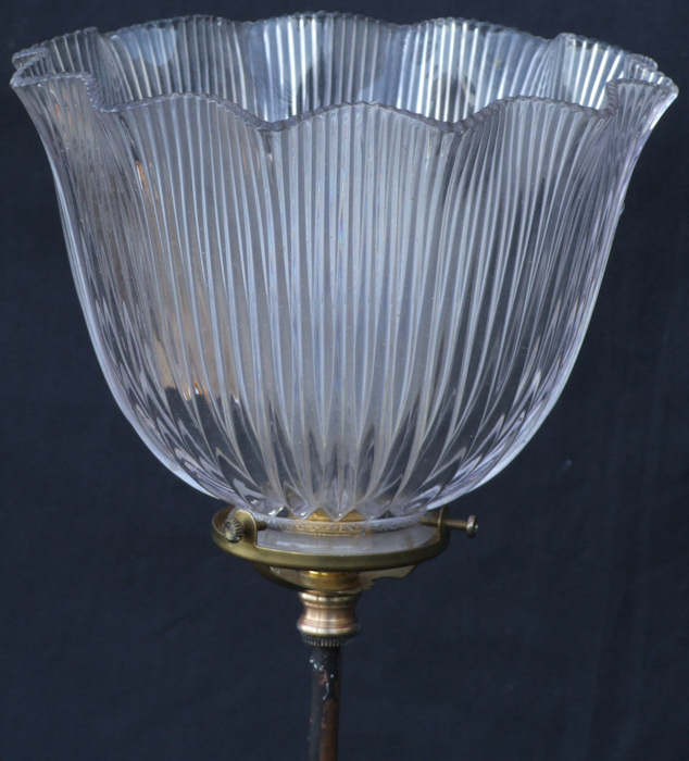 flex which terminates in brass bayonet and lovely opaque reeded shade
