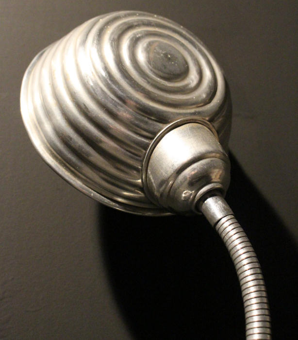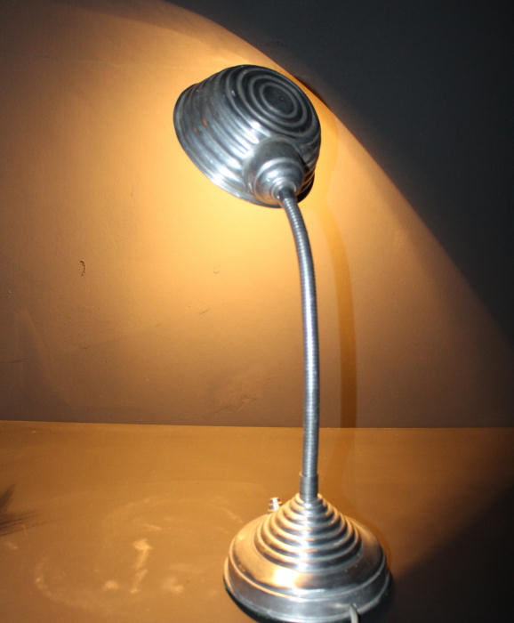 Art Deco Steel and Aluminium Angle poise Desk Lamp Eyecatching Steel and Chrome Angle Poise Desk Lamp dating to the 1930's. Fabulous "spun" aluminium base and shade joined by a bendy chrome stem. New Brown Apiral silk flex and On and off button along the cord (button on the base is blanked off). A generous flex of 2m is supplied with this lamp.