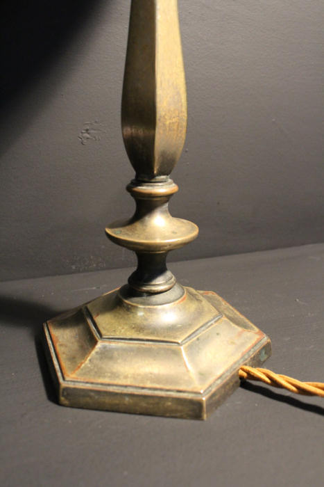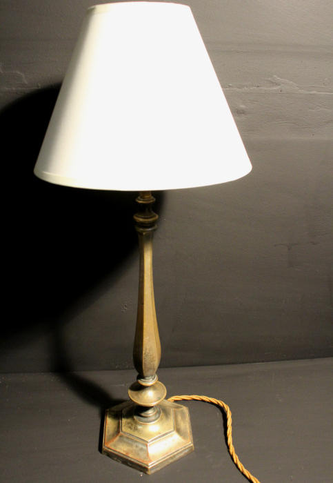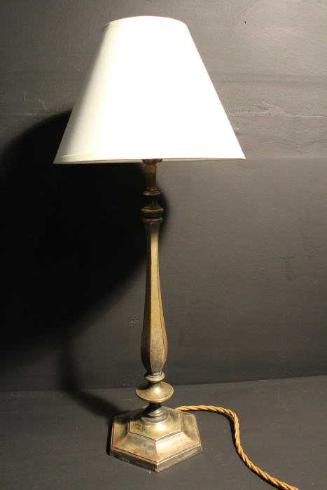 Edwardian Patinated Silver Plate Table Lamp Edwardian Patinated silver plate table lamp with slender faceted stem (slight wear). The attractive angular base ensures that this lamp sits firmly in place. Rewired with a soft gold antiqe style silk 3 core flex, this lamp comes with a new cream shade.
