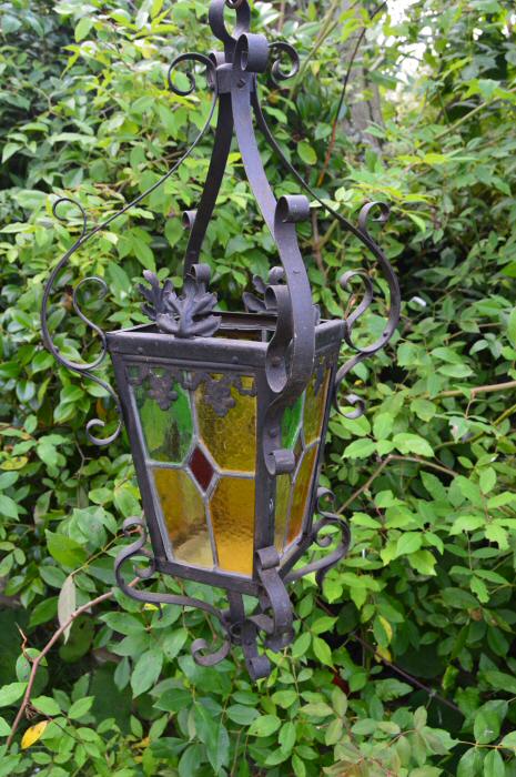 Late Victorian Wrought Iron Lantern A beautiful Late Victorian wrought iron lantern with 4 stain glass panels of amber, pale green and clear glass with central red diamonds, surrounded by scrolling black wrought iron frame. Rewired and ready to install, this is a gorgeous period light suitable for any style of home. Dimensions TBC |