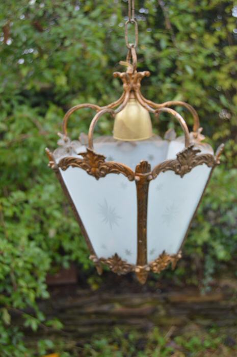 Mid 20th Century 5 sided Brass Hall Lantern A pretty brass hall lantern with 5 sides of frosted glass etched with star motiff. Very attractive, rewired and ready to install. Dimensions TBC Ref LANT11 £185 Delivery £15