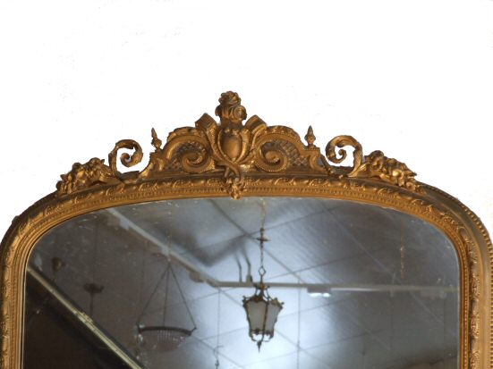 Large Victorian Gilt Overmantle mirror A beautiful large Victorian gilt overmantle mirror with original glass in good condition. The scrolling accanthus leaf detail to each side compliments the pediment which again has pretty carved accanthus detail. The whole a lovely bright colour and a good size.