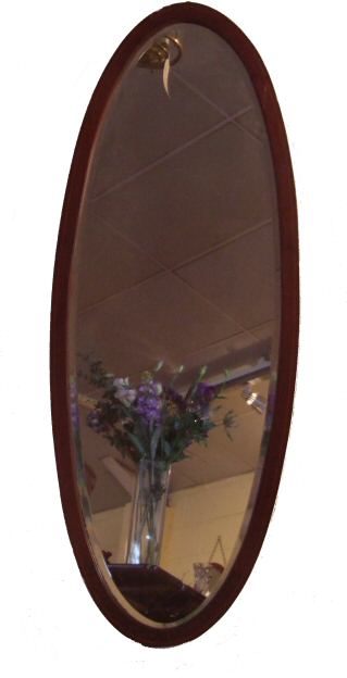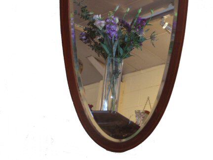 Edwardian inlaid oval mahogany wall mirror perfect for an area where a narrow long mirror is needed