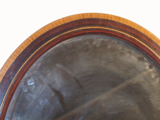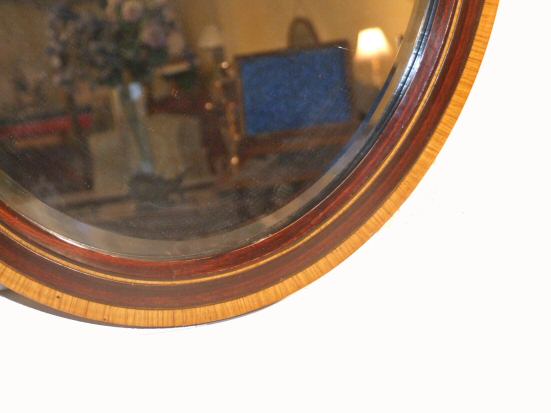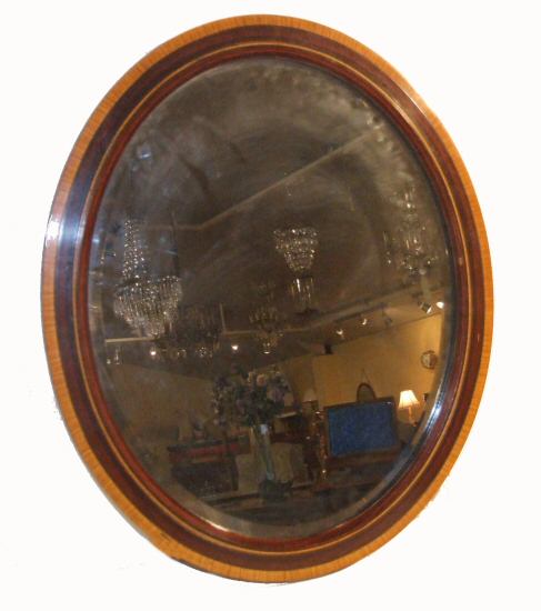 Edwardian mahogany oval inlaid wall mirror A small and useful mahogany inlaid oval wall mirror dating to 1900, the mahogany frame with a thick banding of satinwood to its surround. The original bevelled mirror in good original condition. Height 23" Width 19" Price £75 (Ref:MIR270) |
