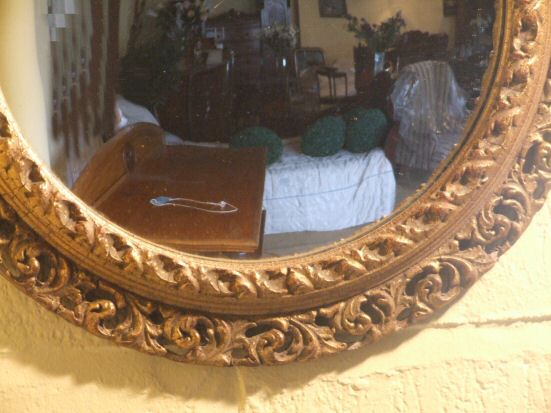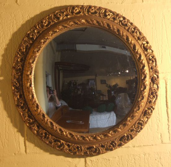 Vintage gilt convex wall mirror A pretty and ornate gilt framed circular convex mirror. Good condition with lovely detail to the frame and original convex mirror which is extremely useful in viewing a whole rooms interior through, used to be used by butlers when serving the gentry at the dining table. width 18" Price £195 (Ref:MIR271) |