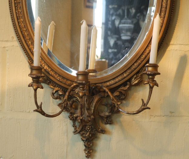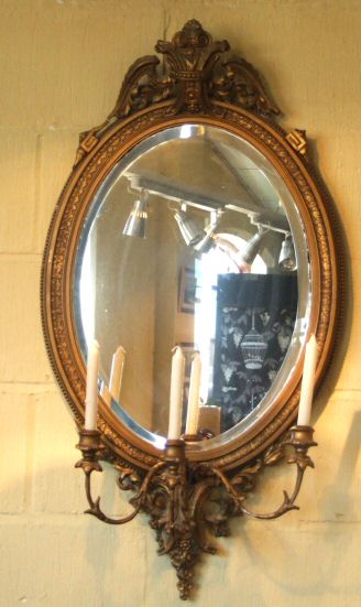 Victorian 3 arm Girondle Gilt Mirror A beautiful example of a Victorian Gilt Girondle mirror of oval outline. A really useful size, not too large and not too small, lovely detailing to the arms and pretty foliate detailing to the lower section with lovely flowers and berries. The whole surmounted by again very attractive foliate scrolling gilt detail. The original bevelled mirror is in lovely condition and the price includes full restoration as there are a few minor losses at present that can be seen in the photo. Height 38" width 21" Price £995 (Ref:MIR277) |
