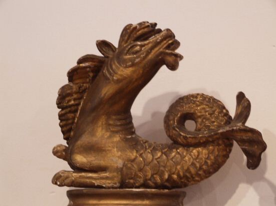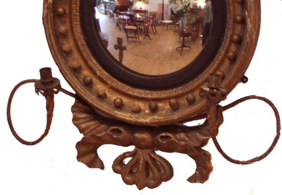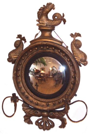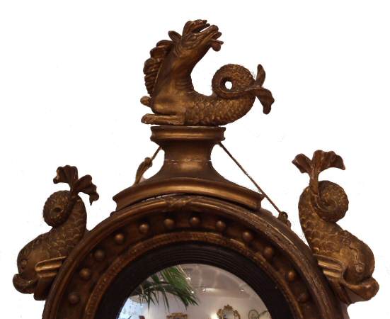 Stunning Regency Gilt Convex Circular Girondal Mirror This highly unusual and decorative antique gilt convex mirror dates to the early part of the 19th Century and is full of wonderful detail. The original convex mirror is in excellent condition and held within a reeded ebonised frame with gilt surround. The lower pediment being of ribbon and acanthus design with 2 delicate girondal arms again with delicate ribbon swag detailing to the candle holders. The mirror itself has the most fantastic decorative sea horse sitting proud at the top with 2 lovely dolphins dressing either side. Extremely unusual and a fantastic example of a Regency Gilt Convex Girondal mirror Height 38" Width 26.5" max Mirror itself 20" Price £2850 (MIR52) Email Us for a delivery quote : Click Here