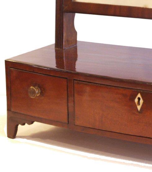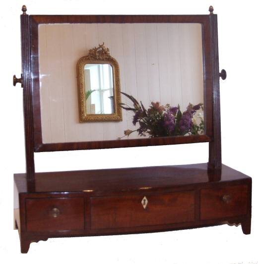 Georgian bow front mahogany dressing table mirror This beautiful Georgian mahogany bowfront dressing table mirror is elegant in design with rectangular mirror in a mahogany surround supported by reeded upstands and brass finials. The whole surmounted on a bowfront base consisting of 3 drawers, 2 with brass handles and the central drawer with ivory escutcheon. Raised on small bracket feet. Presented in lovely condition. Height 19.5" Width 20.5" Depth 8.5" (Ref :MIR56) Email Us for a delivery quote : Click Here