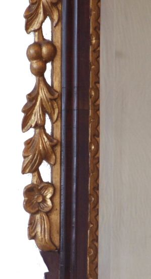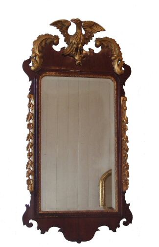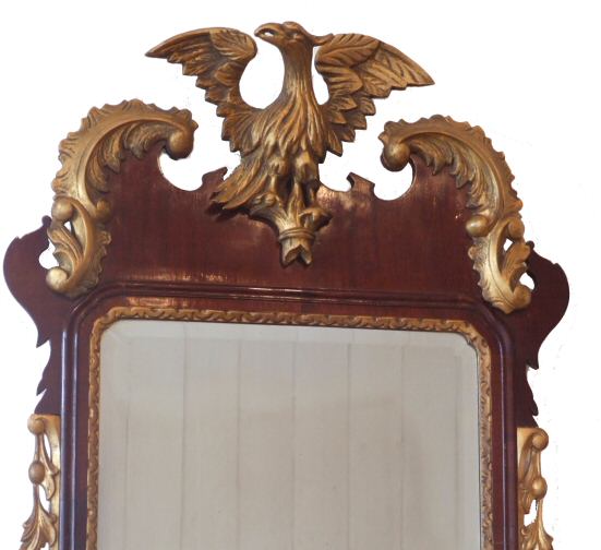 A large substantial mahogany Chippendale Period Revival Wall mirror with gilt Ho Ho Bird A stunning, large, Chippendale Period Revival mahogany wall mirror surmounted by an impressive gilt Ho Ho bird with outstretched wings, the pediment also having attractive accanthus gilt detailing, the bevelled mirror is original and in good condition with only slight marking and is surrounded by a gilt slip and mahogany surround, the sides decorated by attractive leaf and floral gilt decoration. A lovely wall mirror in very good condition. Height 46" Width 23" £675 (Ref : MIR61) Email Us for a delivery quote : Click Here