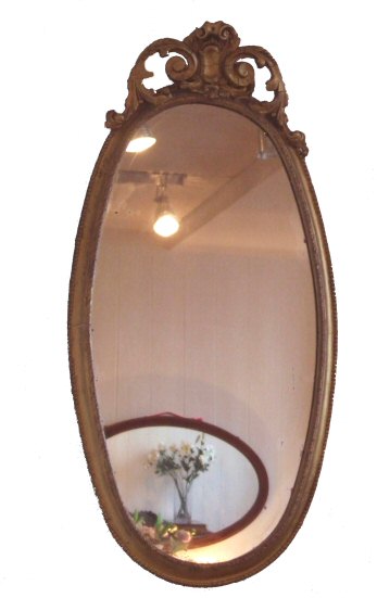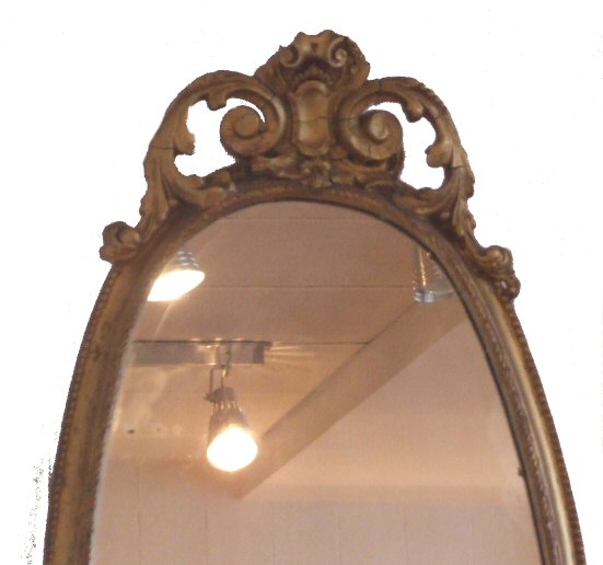 Victorian narrow oval gilt plaster mirror A pretty Victorian oval narrow wall mirror in gilt with acanthus detailing to the top. Simple and understated, a few signs of wear commensurate with age but nothing detremental.