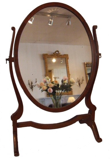 Edwardian mahogany dressing table mirror This attrractive Edwardian mahogany dressing table mirror with oval mirror is suported by a skeleton frame standing on shaped feet. The dainty brass catches to the side allowing the mirror to tilt gently and be held in place firmly.