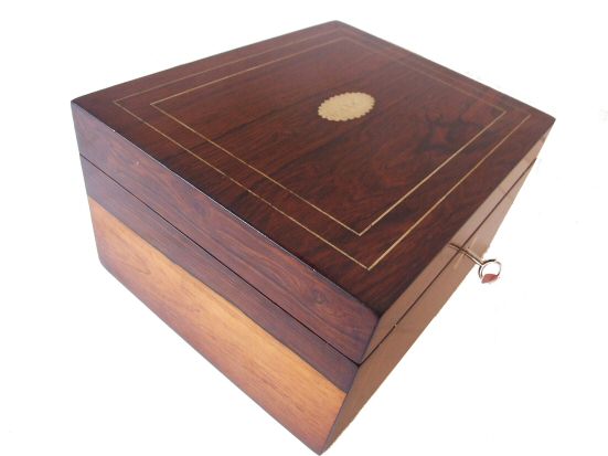 Regency Rosewood Jewlery Box with Brass Inlay A beautiful example of a Regency Jewlery Box in Rosewood, this highly figured example is in stunning condition with brass line inlay and central brass motif and escutcheon..The lock is fully working and this lovely piece has been relined with a deep green silk which complements the Rosewood perfectly. Width 9.5" Height 5" Depth 7.5"