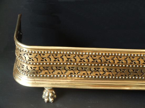 Fine quality Victorian brass fender Solid and substantial this lovely Early Victorian brass fender is in beautiful condition having been professionally buffed to highlight the lovely cental panel of oak leaf decoration which is supported on substanial well defined lion paw feet, the ash plate in excellent condition with 2 slots for fire tools. A beautiful piece in lovely condition. Width 47" Depth 13" max Height 9.5"