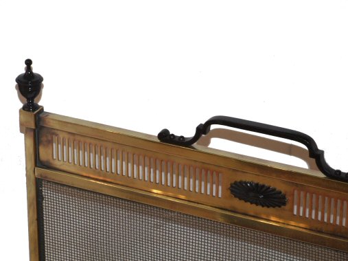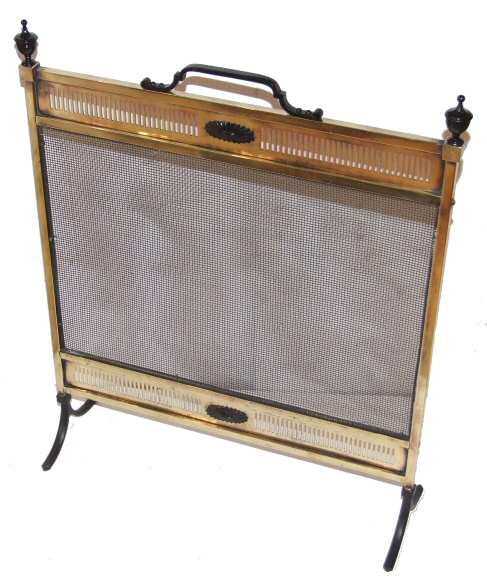 Edwardian brass firescreen A pretty Edwardian brass firescreen standing on splayed feet with brass fretwork to the frieze and black finials to the top, black handle and black rosette decoration.. Height 27" Width 22.5" sold