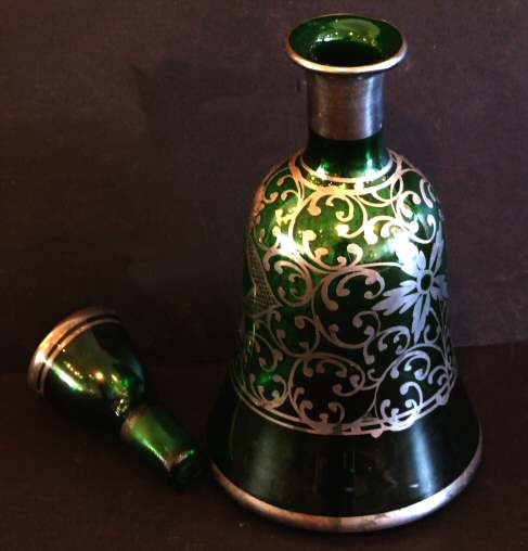 1930 Green Decanter Beautiful green decanter with silver scrolling decorative detailing to the body with flat stopper in perfect condition. The ideal gift for this Christmas.