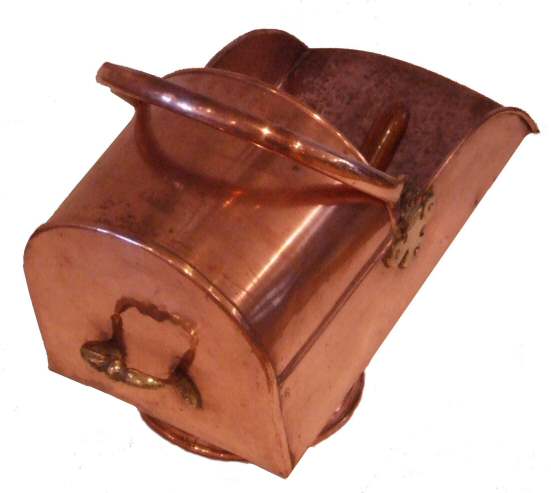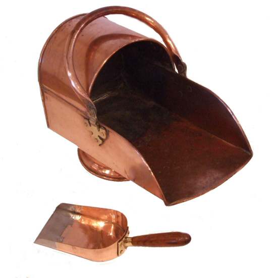 Edwardian copper coal skuttle and shuvel A fabulous example of an Edwardian deep Helmet Copper coal skuttle with shuvel. The attractive brass handle with further brass embelishment to the main copper handle , standing on a circular base this copper coal skuttle is very deep and provides excellent storage for large fires this winter. Of slightly more angular design this is an attractive and useful fireplace accesory. Lovely! Width " Depth 18" Height 11"