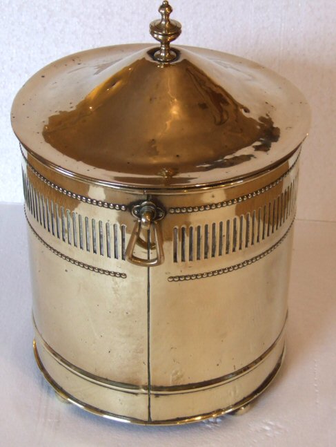 Edwardian Brass Coal Bin Circa 1900 a cylindrical brass coal bin in excellent condition. Features pierced fret work design and brass drop handles, above is a lift off lid with attractive ornate brass finial, the whole raised on circular bun feet. Excellent condition ..fully buffed and ready for use