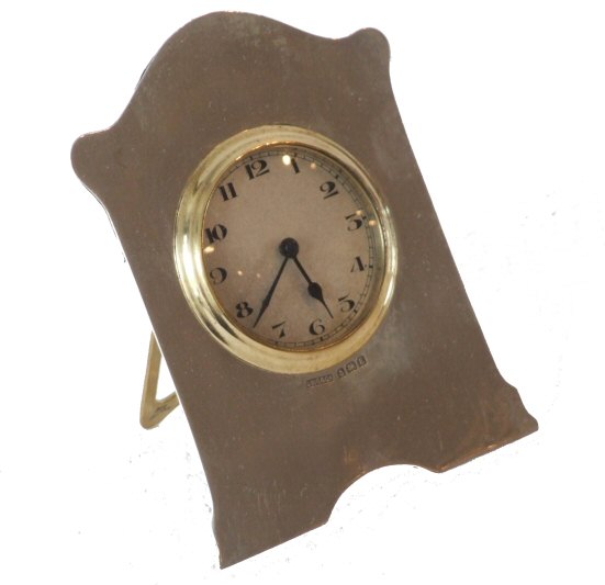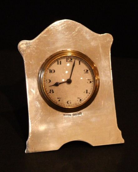 Solid Silver Antique Travel Clock by SWG&Co Fully Hallmarked this lovely solid silver travel clock has brass bezel with convex lens surrounded by attractive solid silver frame. The back having leather surrounding the working mechanism. This lovely clock by SWG&Co has hallmarks of an anchoe , lion and letter E. Beautiful and rare, fully working. Width 3" Height 4" Price £265 (Ref : MISC186) Email Us for a delivery quote : Click Here