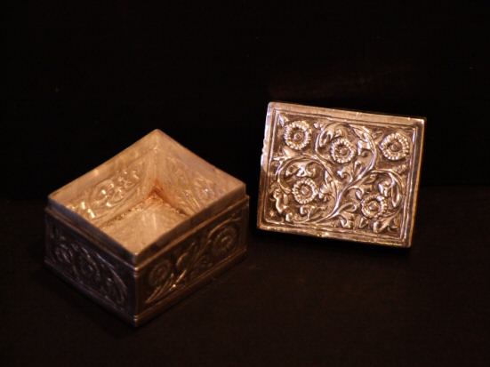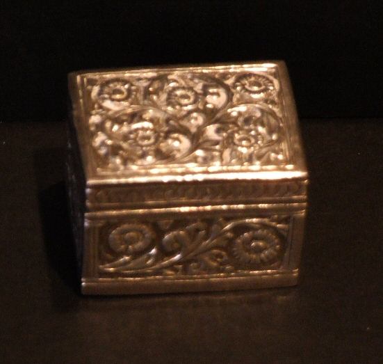 Continental silver pill box This lovely little silver pill box is full of wonderful detail, the sides and lid with wonderfrul etched flowers and leaves. Lovely original condition. Width 4cms Depth 3.5cms Height 2.5cms