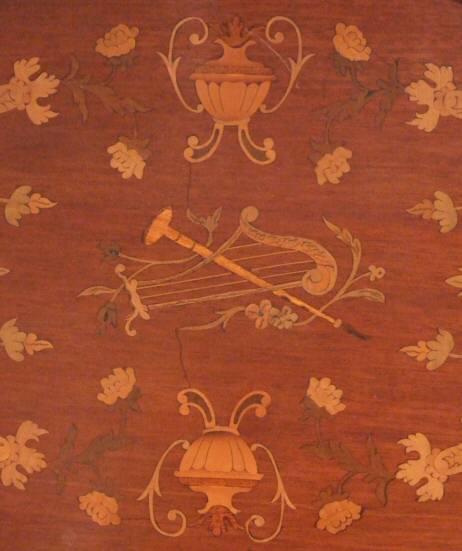 Fabulous Edwardian Inlaid Oval Tray A fabulous example of an oval inlaid Edwardian tray. This mahogany tray has wonderful marquetry inlay to the centre depicting musical instruments in the form of a central harp crossed with a horn. The floral border consists of roses, leafs and urns. A wonderful example in excellent condition with brass handles. Width 26" Depth 17.5" £295 (Ref : MISC194) Email Us for a delivery quote : Click Here