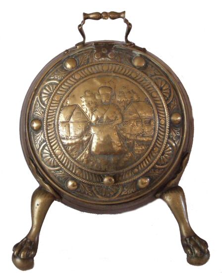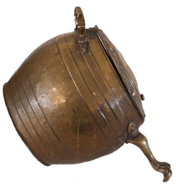 Rare and unusual Edwardian brass coal skuttle This very unusual antique brass coal skuttle is in the form of a barrel raised on attractive lion paw feet. The embossed lid opens to reveal ample room for coal. At the back of the skuttle is a handle to help with carrying the coal. The lid is of dutch design with a lady in costume taking centre stage. Lovely! Width 12" Depth 13" Height 18"