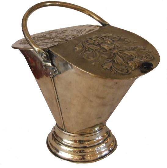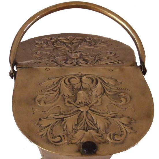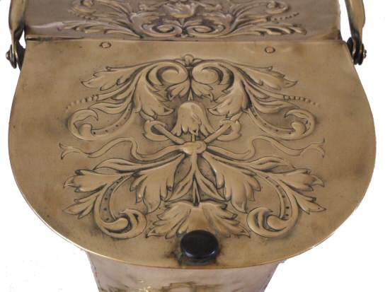 Rare and unusual Edwardian brass coal skuttle This beautiful antique brass coal skuttle has a double embossed lid, depicting ornate accanthus detail either side. One side opening to allow access to the coal the other side fixed, raised on a circular plinth this is a beautiful item in lovely original condition.