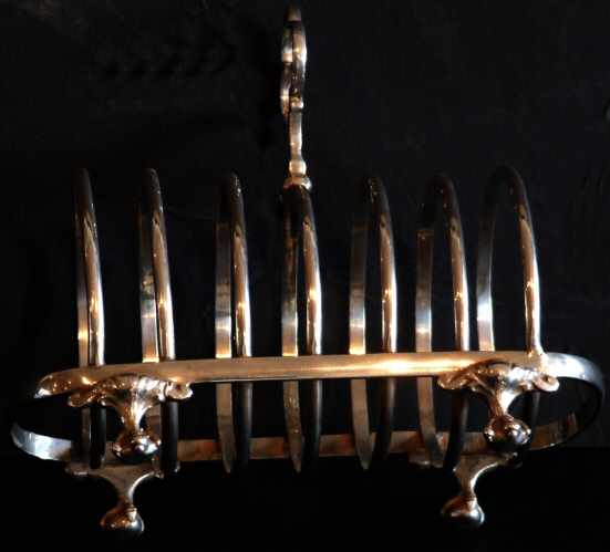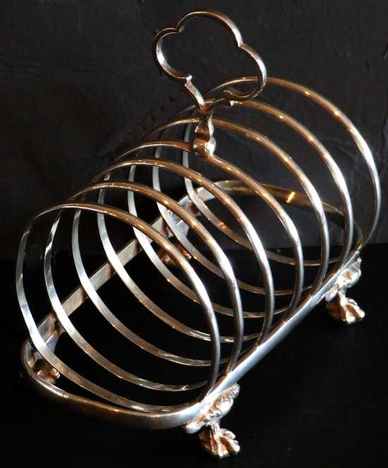 Circa 1901 silver toast rack Circa 1901 a beautiful silver (Letter F) 6 division toast rack comprising of 7circular bands contained within a d ended rectangular frame the top surmounted by a pretty loop handle and raised upon ornate ball and claw feet (griffin feet). Excellent condition, very useful and a wonderful gift. Width 6.5" Depth 3" Height 5.75" |