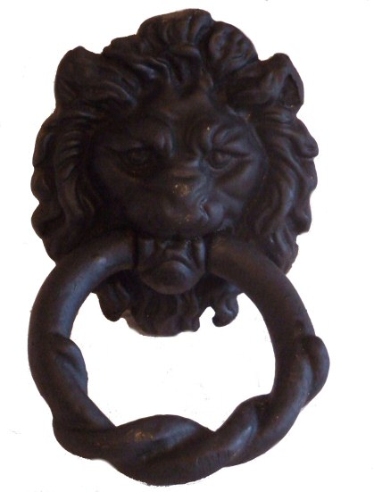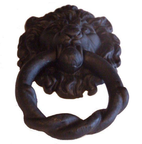 A well defined lion door knocker, the face of a well defined lion holding the rope twist ring which acts as the knocker.