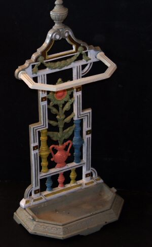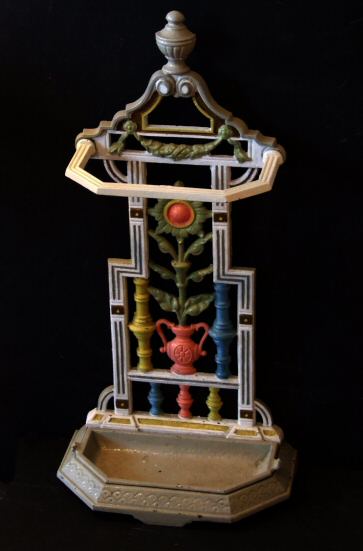 Circa 1900 a pretty cast iron stick/umbrella stand Circa 1900 a pretty and practical cast iron umbrella/stick stand. This lovely item features a removeable drip tray with a pierced fret back of jardinere and foliate design surmounted by a ribbon swag and urn. Excellent condition having been painted at some point during its life. Height 29" Width 14" Depth 7.5" £225 (Ref:MISC218) Email Us for a delivery quote : Click Here