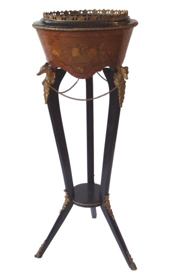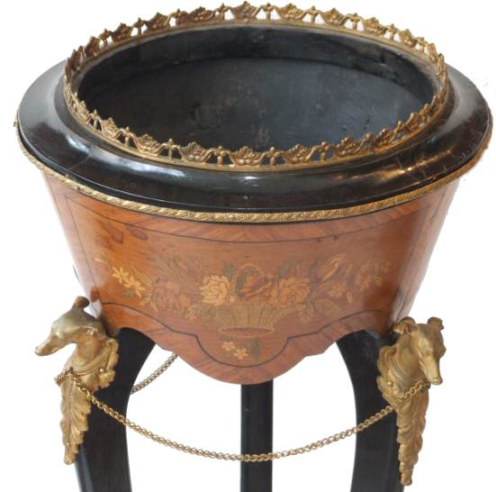 Stunning Decorative antique Jardinere Dating to Circa 1880 this beautiful highly ornate jardinere has many wonderful qualities it is hard to know where to start. The body has beautiful floral marquetry to its entirity. The ebonised legs of cabiole design have greyhound gilt mounts to the tops with chain joining all three, and 2 further gilt mounts to the feet and ankles of the legs. The brass gallery is fretted and of foliate design. In beautiful original condition this is a rare and desirable piece. £695 Height 36" Width 13" (Ref:MISC226) Email Us for a delivery quote : Click Here