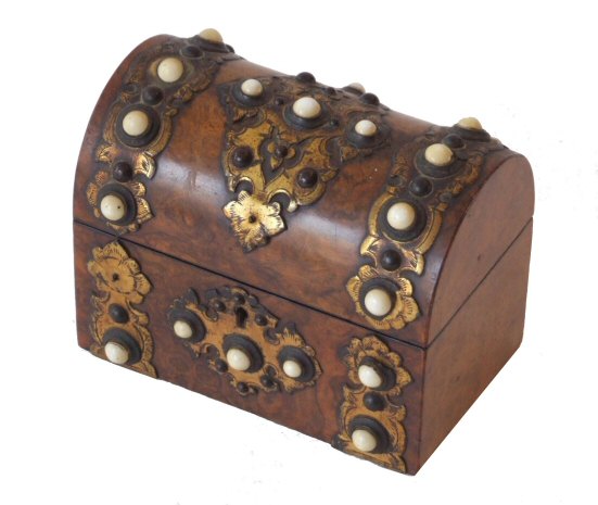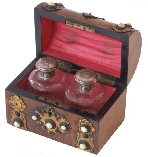 Victorian burr walnut domed top scent casket A beautiful 19th Century burr walnut domed topped scent casket with chased brass strap work inset with white porcelain spheres. The locking lid lifts to reveal the original pink silk lined interior with 2 silver topped matching scent bottles. A beautiful piece in lovely original condition. Width 5.5" Height 5" Depth 3.5" Price £275 (Ref:MISC228) Email Us for a delivery quote : Click Here