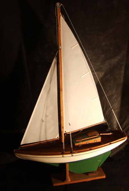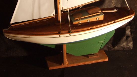 Antique model of a pond yatch Circa 1920, a classically shaped deep keel model of a pond yatch. The top side in white with thin gold line just below the gunwhales features a teak coloured deck with the coach roof to the cabin in duck egg blue. 2 sails hoisted by single mast with various associated lines, with moving rudder and tiller. Price £395 Length 29" Height 42.75" (Ref:MISC608)
