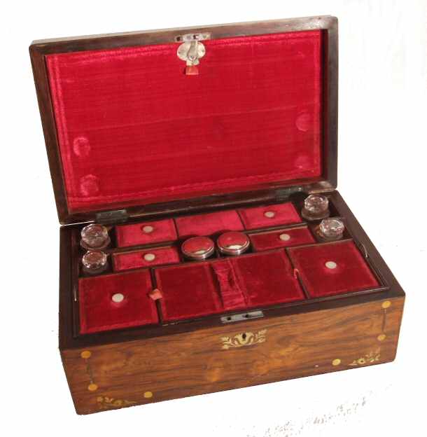 A beautiful example of a Regency rosewood jewlery box with attractive slightly faded case in lovely condition, the mother of pearl decoration depicting flowers and leafs with central floral motif and eschutcheon. Full working lock and key provided. The lid opens to reveal a wonderful fitted interior in red velvet with original scent bottles of varying sizes, the velvet lined sections having lift up lids to reveal lots of different shapes and sizes of storage. The whole front section lifts out to reveal more storage for extra pieces one may have. The lid has a red velvet lined panel which opens to reveal space for hiding important documents or letters etc. Full of character and beauty. This is a timeless piece of history and would make a wonderful gift for the lady in your life. Price £395 (Ref:MISC616)
