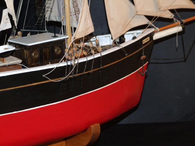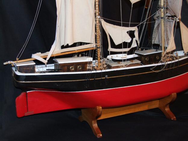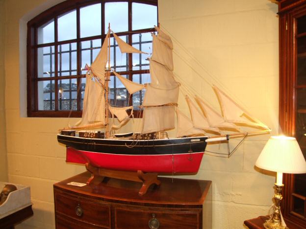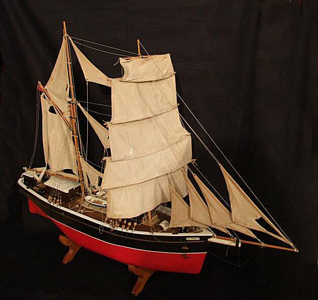 Fabulous very large model boat "Sir Percy of London" This stunning, large model boat of the "Sir Percy London" is a wonderful remote control example (remotes needed), we are selling it as a display model only, the red and black hull is extremely impressive and it sits on a wooden cradle. The ship has 3 large masts and many sails and has many lovvely details such as anchor, and dinghies included. It is a beautiful model and in lovely condition although the sials have a few minor tears but overall this doesnt detract from this impressive spectacular model boat. A must for any true boating enthusiast. Length 59" Height 44" Price £595 (Ref;MISC623) Email Us for a delivery quote :Click Here