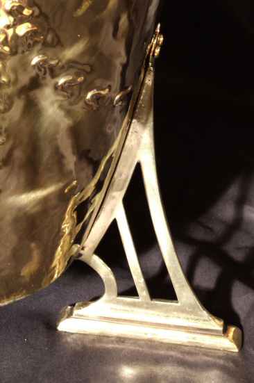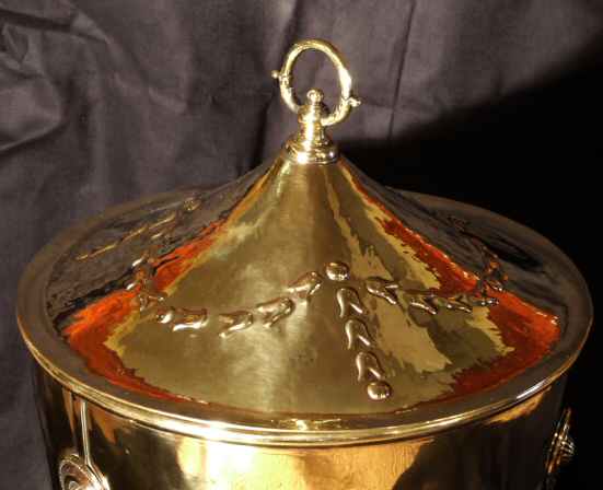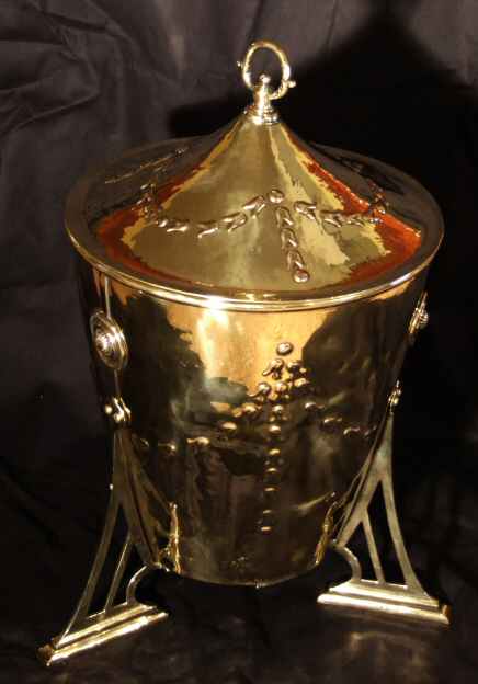 Beautiful embossed brass coal bin A very attractive brass coal bin with embossed bellflowers to the lid and sides standing on angular feet. Excellent condition. Heigth 20" Width max 14" Price £195 (Ref :MISC625) Email Us for a delivery quote :Click Here