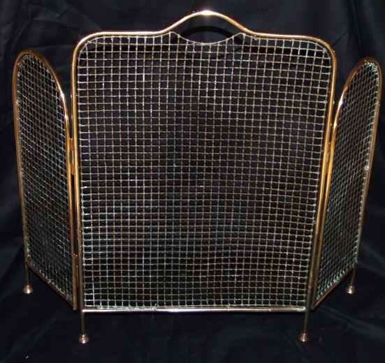 Edwardian 3 fold brass firescreen A pretty example of an Edwardian brass firescreen with original brass bun feet and excellent mesh work. Buffed to a lovely bright shine and ready to use. The sides folding out to provide more protection from stray sparks having attractive rounded tops. Very useful and attractive. Heigth 22.5" Width of centrl panel 15" side panels 72 each Price £125 (Ref :MISC630) Email Us for a delivery quote :Click Here