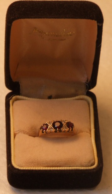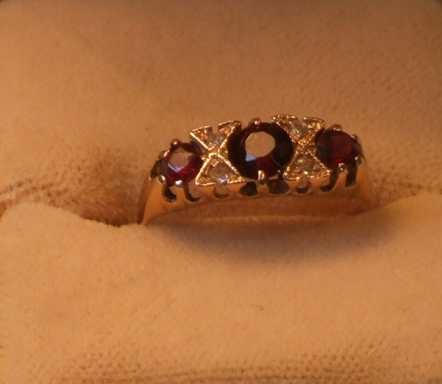 A lovely antique ring with 3 ruby stones surrounded by small diamonds.