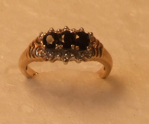 A lovely antique ring with 3 saphire stones surrounded by small diamonds. Size I.